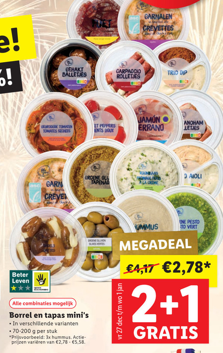 27 knoflook garnalen crevettes gehakt balletjes carpaccio rolletjes trio dip gedroogde tomaten tomates sechees peppers doux groene roomkaas fromage frais la creme aioli dieren bescherming beter leven combinaties borrel tapas stuk 3x hummus varieeren olives pesto to megadeal jan 17