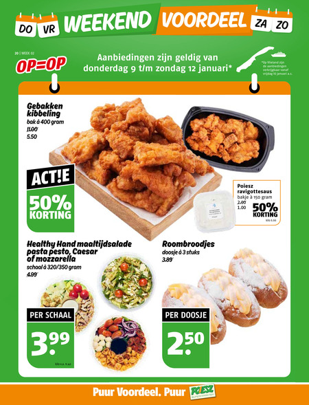 10 12 20 50 150 400 weekend voordeel week 02 januari vlieland vrijdag a.s. gebakken kibbeling bak healthy hand maaltijdsalade pasta pesto caesar mozzarella schaal 320 350 roombroodjes doosje stuks kilo v.a. puur supermarkten ravigottesaus bakje