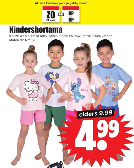 27 99 100 128 kindershortama o.a. hello kitty stitch sonic paw patrol katoen maten elders