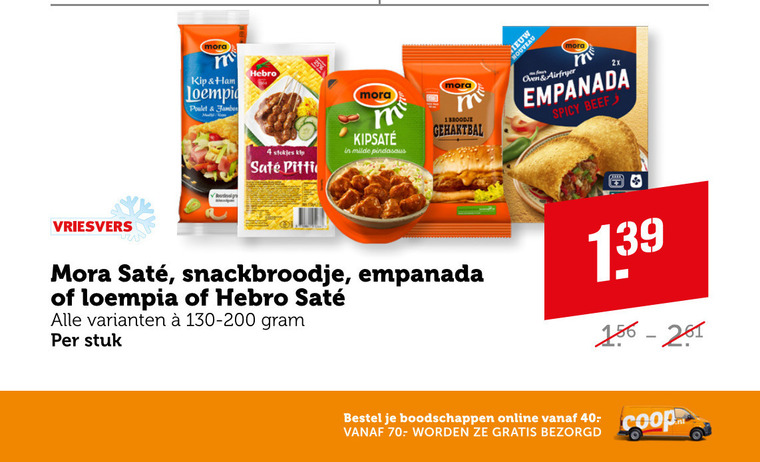 loempia satevlees 40 mora kip ham poulet jambon hebro stokjes sate milde pindasaus broodje gehaktbal oven airfryer 2x empanada spicy beef vriesvers snackbroodje stuk online