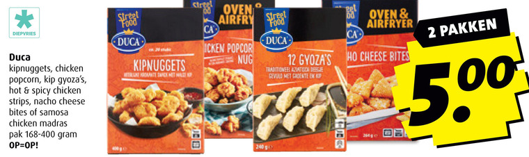 12 diepvries duca kipnuggets chicken popcorn kip hot spicy strips nacho cheese bites samosa madras pak street food oven airfryer groente pakken
