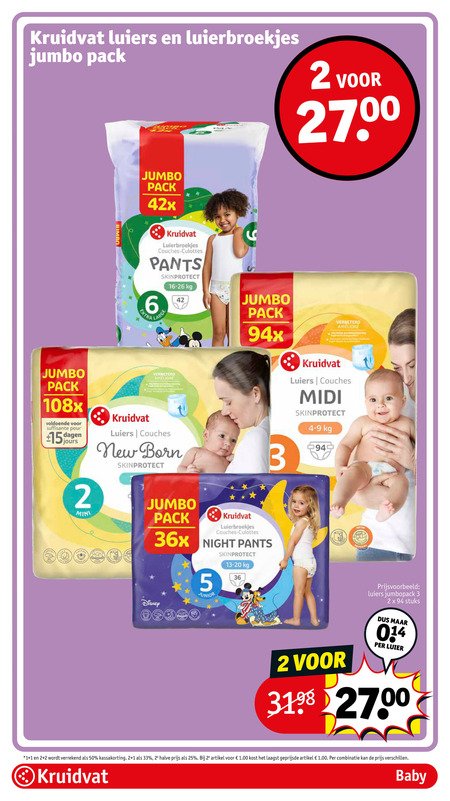 15 25 33 36 42 50 kruidvat luiers luierbroekjes jumbo pack culottes pants skinprotect large midi pour dagen new born mini night junior disney jumbopack stuks luier baby 2e halve artikel combinatie