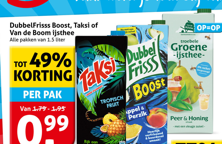 99 dubbelfrisss boost taksi boom ijsthee pakken liter pak zuivel dubbel rijk tropisch fruit energie frisss appel perzik verfrissend boordevol co troebele groene suiker peer honing vleugje