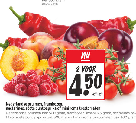 300 450 500 nederlandse pruimen frambozen nectarines zoete puntpaprika mini roma trostomaten bak schaal kilo punt paprika zak