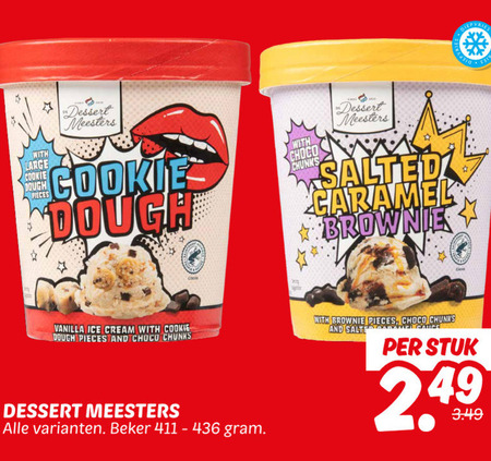 ijsspecialiteit diepvries with large cookie dough pieces dessert meesters choco chunks salted caramel brownie vanilla ice cream and beker vries stuk