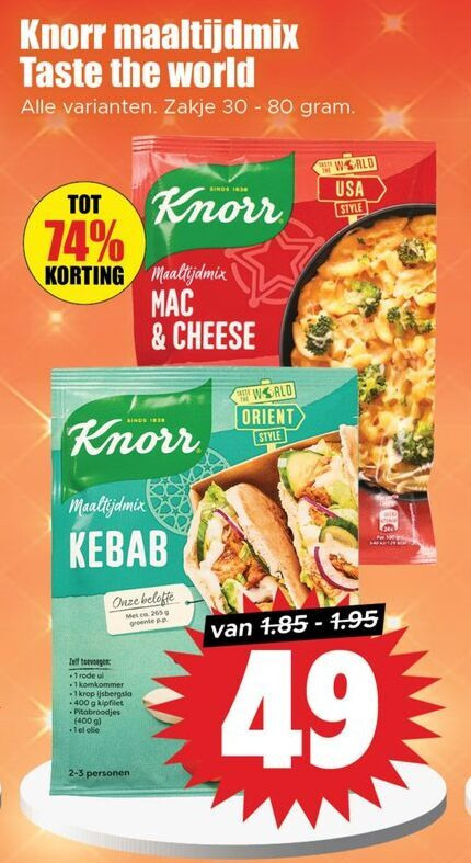 30 80 400 knorr maaltijdmix taste world zakje mac cheese kebab rode ui belofte komkommer krop ijsbergsla kipfilet pitabroodjes olie personen wald orient style usa
