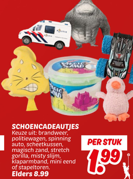 schoencadeautjes brandweer politiewagen spinning auto scheetkussen magisch zand stretch gorilla misty slijm klaparmband mini eend stapeltoren elders stuk